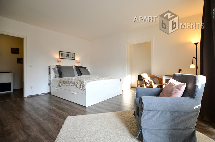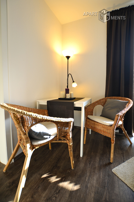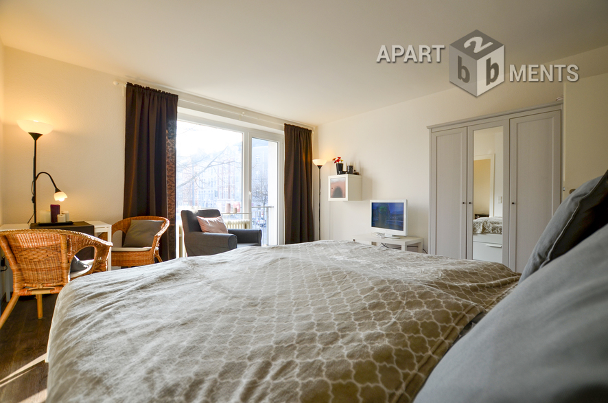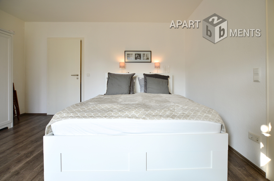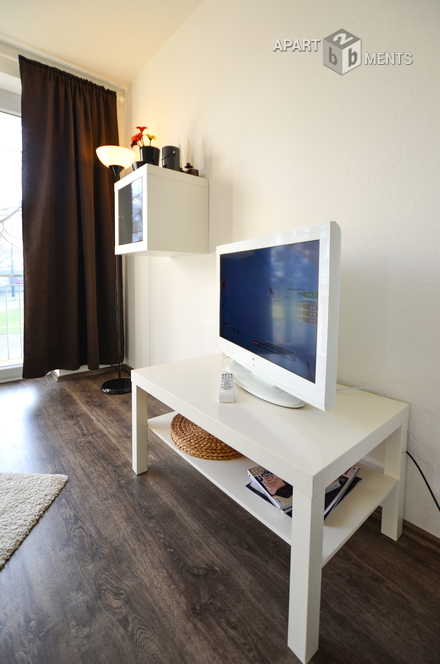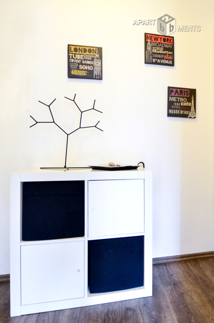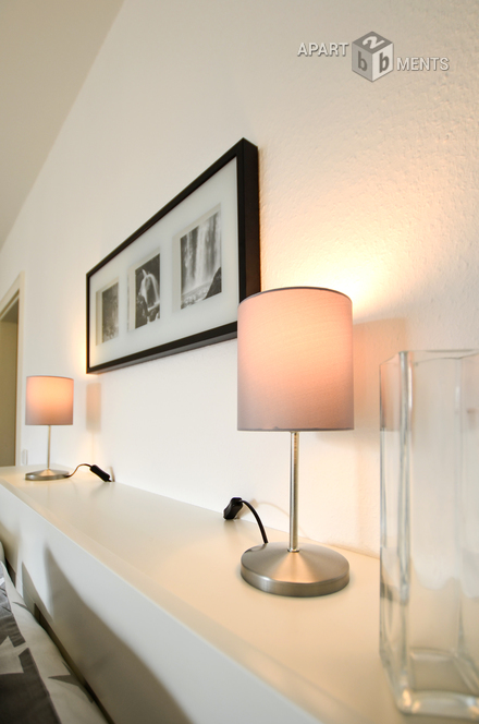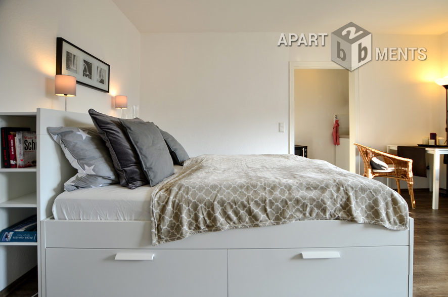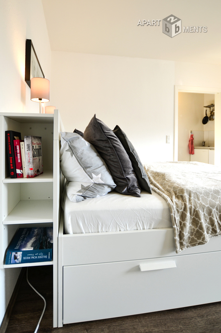 Das Apartment überzeugt den Mieter allein schon durch seine helle Einrichtung. Die moderne Möblierung im IKEA-Stil wirkt einladend und gemütlich. Dem Mieter steht ein großes, hohes 160 x 200 cm Doppelbett zur Verfügung. Integrierte Schubladen im Bett bietet Stauraum. Ein weiterer Pluspunkt neben einem Flatscreen-TV ist das kostenfreie und inklusive WLAN.