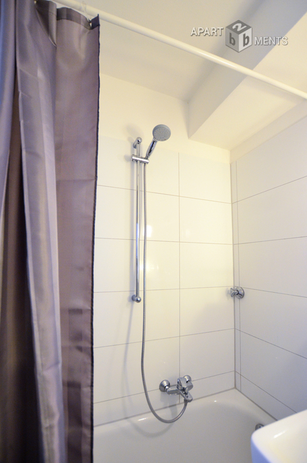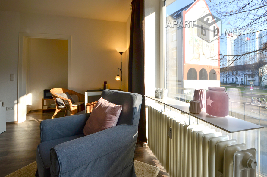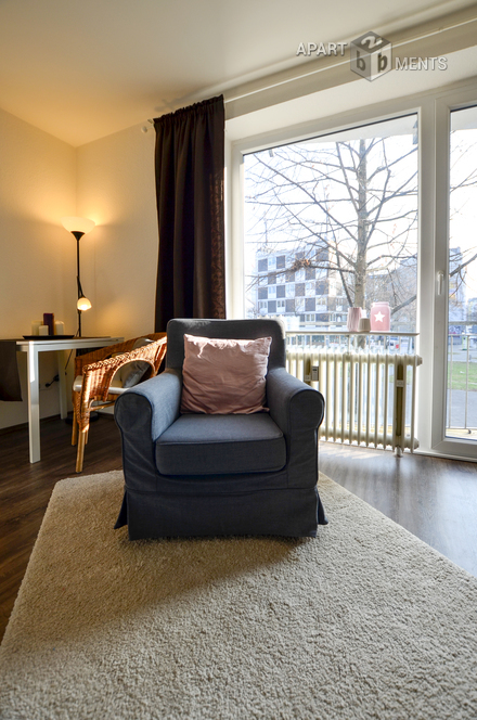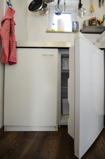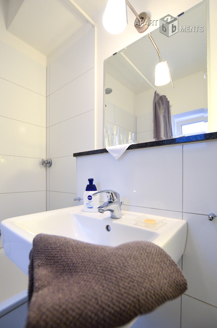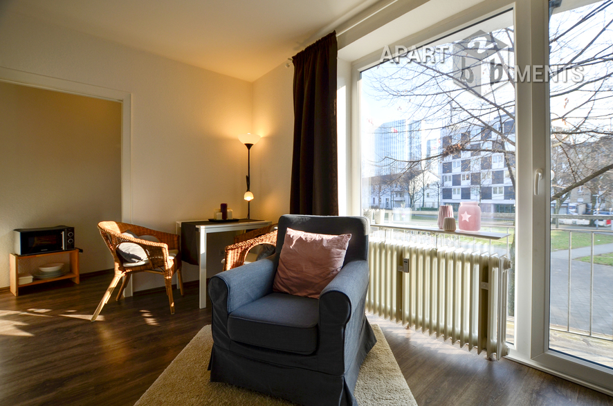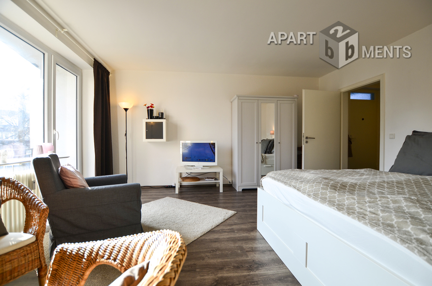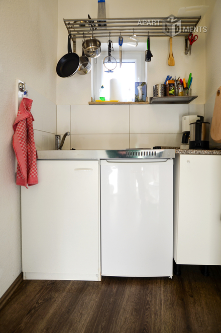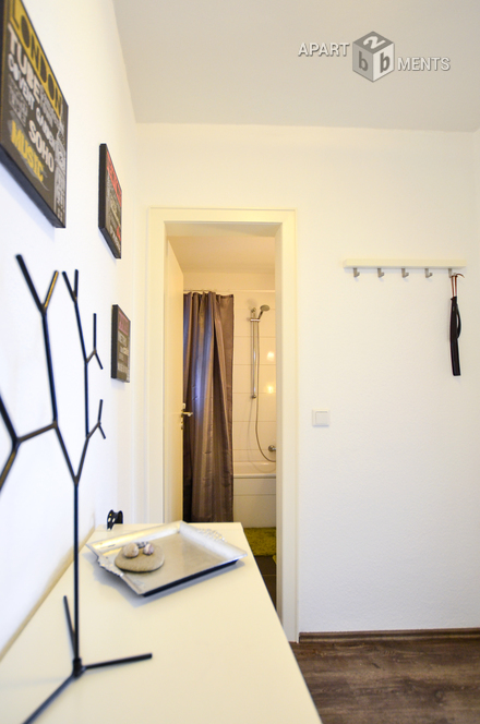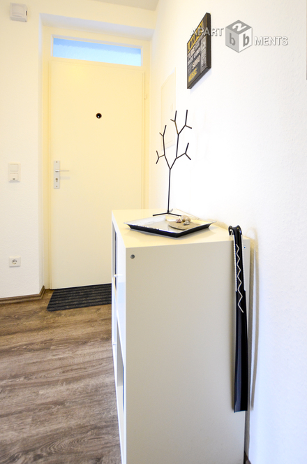 Das Apartment überzeugt den Mieter allein schon durch seine helle Einrichtung. Die moderne Möblierung im IKEA-Stil wirkt einladend und gemütlich. Dem Mieter steht ein großes, hohes 160 x 200 cm Doppelbett zur Verfügung. Integrierte Schubladen im Bett bietet Stauraum. Ein weiterer Pluspunkt neben einem Flatscreen-TV ist das kostenfreie und inklusive WLAN.
