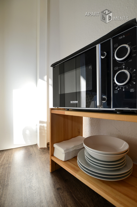 Darüber hinaus verfügt das Apartment über eine kleine Sitzecke, einen kleinen Balkon und eine separate Pantryküche mit Abstellraum. Die Küche hat zwei Kochplatten, eine Grill-Mikrowelle sowie einen Kühlschrank.
