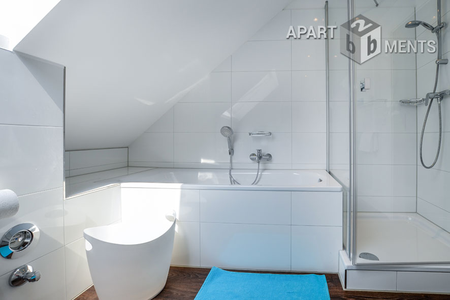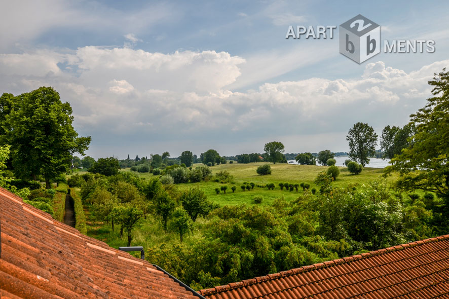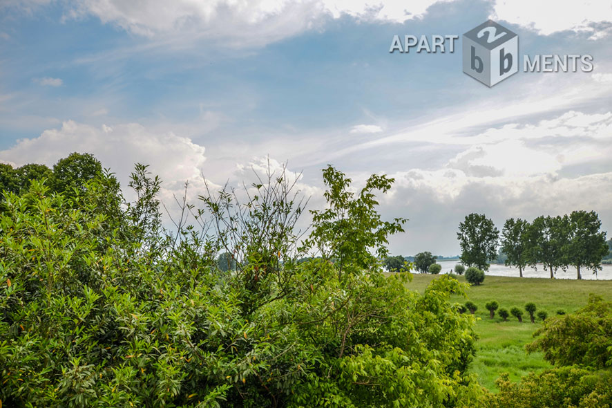 Das Wohnzimmer besticht durch viel Tageslicht. Vom Fenster aus hat man einen Ausblick auf den Rhein. Darüber hinaus befinden sich hier ein großes Sofa, ein TV sowie der Zugang zum Essbereich mit Schrankwand. Das Badezimmer der Wohnung besticht mit einer Dusche, einer Badewanne, zwei Waschbecken und einem WC. Auch ein Gäste-WC ist vorhanden.