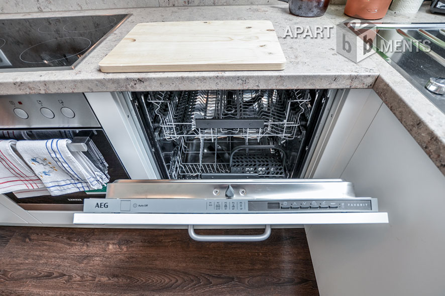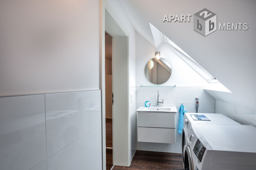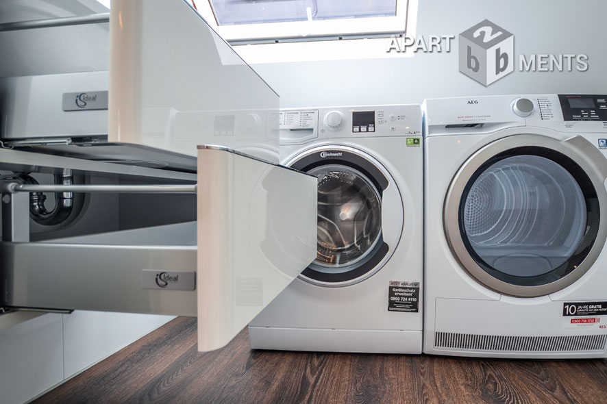 Drei Vorteile der Wohnung: Eigene Waschmaschine und Trockner, WLAN inklusive mit eigener Rufnummer sowie ein eigener Tiefgaragenplatz im Haus nebenan inklusive.
